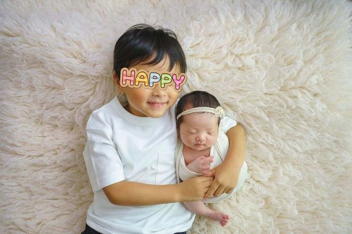 娘さんのニューボーンフォト。お兄ちゃんにすっぽり抱きかかえられた新生児の妹さん。
