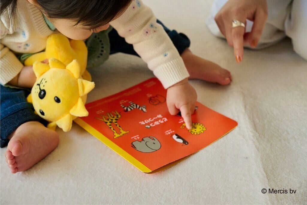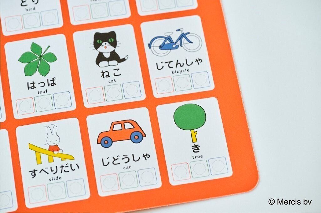 半分に折りたたむと、ミッフィーの絵本風デザインの表紙になってとってもかわいい! 約19×20cmサイズになるのでバッグに入れやすく、お外遊びに持っていきやすいのもうれしいポイント。また、厚紙でできているので、丈夫なのも特長です。