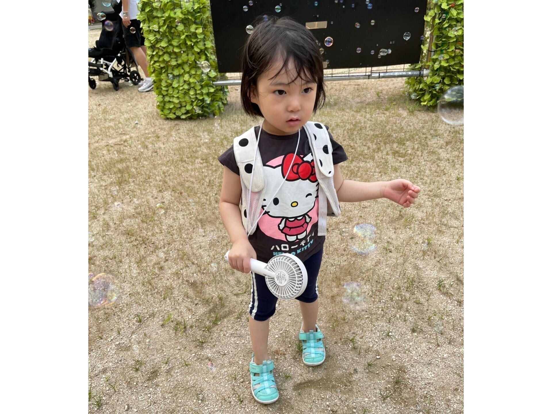 真夏の外出時には保冷剤を入れられるベストを着せ、手持ち扇風機と、霧吹きを吹きかけて体温を下げる工夫をしています。