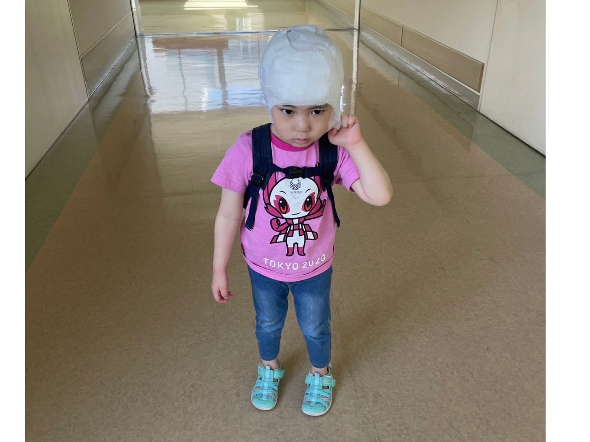 仁菜ちゃん4歳の検査入院で頭に脳波を測る電極をつけています。