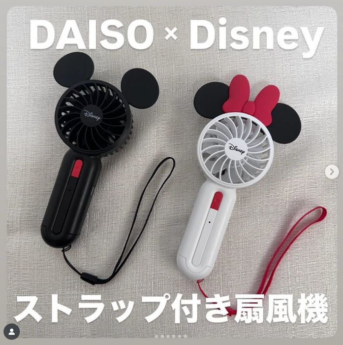 ayachan0803さんがダイソーで購入したのは、ディズニーデザインで激かわの「扇風機 ストラップ付(ミッキー/ミニー)」。各1,100円で、風力は3段階で切り替え可能とのこと♪ 充電式(USB Type-C)で最大約3時間使用できるようです。