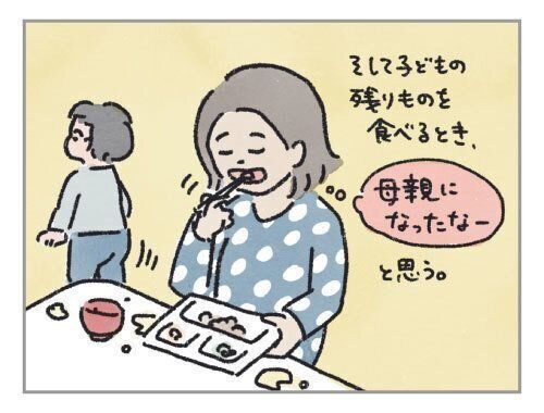 ・・・そして子どもの残り物を食べる時、「母親になったなー」と思います。小さいころ、自分の残したものを、いつも母親が食べていたなあと、ふと思い出すのです。