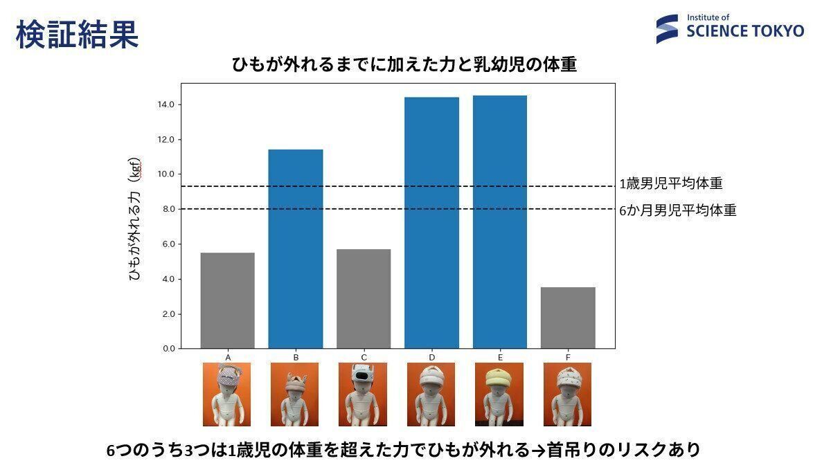 山中 調査では、市販されている6種類のヘッドガードに専用の器具をつけて引っ張り、何kgの力がかかるとあごひもがはずれるか調べました(上記グラフ参照)。