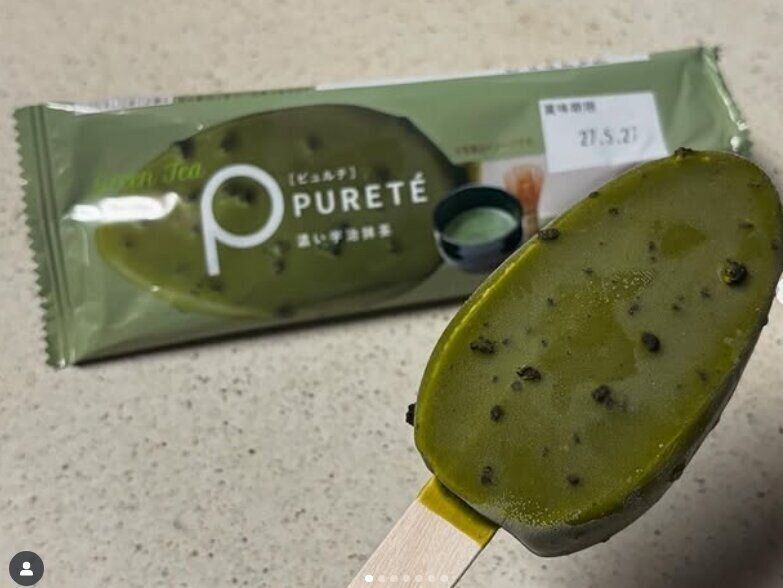 みささんは、シャトレーゼアイスの中でも人気シリーズである「ピュルテ」の新作「濃い宇治抹茶」を購入したそうです。北海道産生クリームと宇治抹茶を使用した抹茶アイスを、クランチ入りの抹茶チョコでコーティングしたリッチな味わい。抹茶好きなら要チェックです!