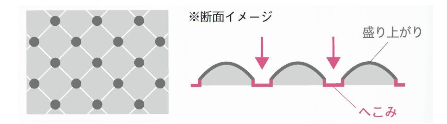 肌に直接触れる面には、針の穴のように小さなへこみがあるため、まわりの不織布が盛り上がってふわふわもちもちの肌あたりに。