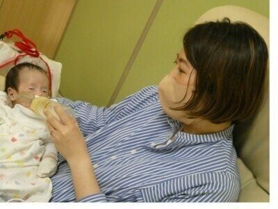 りまちゃんの肺は少しずつ成長して生後1カ月を越えたころには、人工呼吸器をはずせて、お口からミルクを飲み始めました。