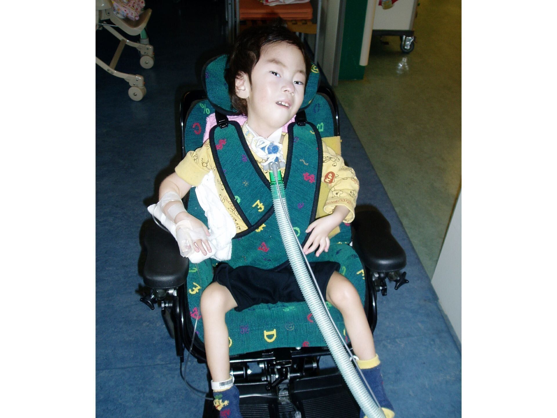 1歳半ごろのあきらさん。退院準備のために車いすに座っています。