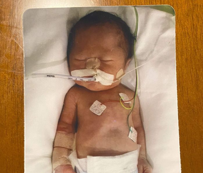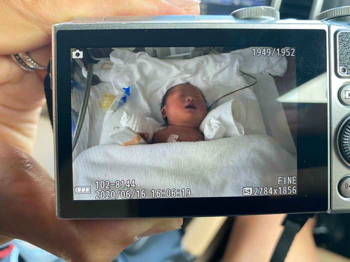 生まれた直後の長男の様子。長男は、呼吸の状態が悪く、生まれてすぐにNICUに入院。コロナ禍で面会ができず、写真は看護師さんが撮影してくれたもの。