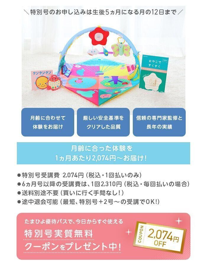 <こどもちゃれんじbaby>特別号が実質無料の2,074円OFFになるお得なクーポンを「たまひよの優待パス」で限定配信中。ぜひチェックしてみてください!