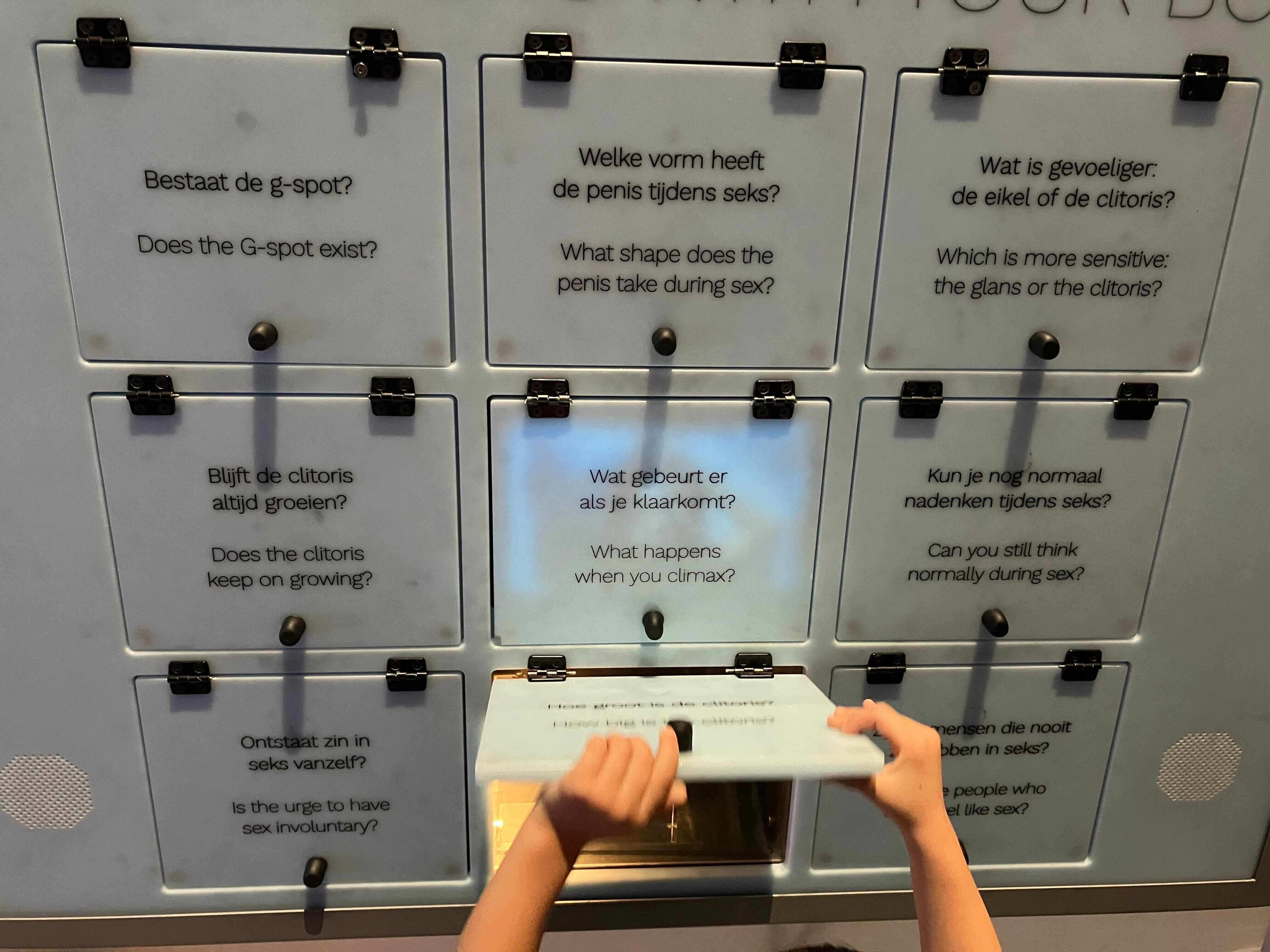 また性行為についてたくさんのQ&Aコーナーが設けられており、「How often do people have sex?(人々はどのくらいの頻度でSEXするのか?)」「Do people of 70 and older have sex?(70歳以上の人はSEXするのか?)」といった「えっ、それ気になる…!」というお題設定に引き込まれ、多くの人が足を止めて展示を見ていました。また「Does the G-spot exist?(Gスポットは存在するのか?)」「Which is more sensitive:the glans or the clitoris?(亀頭とクリトリスはどちらが敏感か?)」など日本においては成人雑誌やエロサイトでしか取り扱っていなさそうなお題を堂々と科学館で回答してくれるオープンさ。