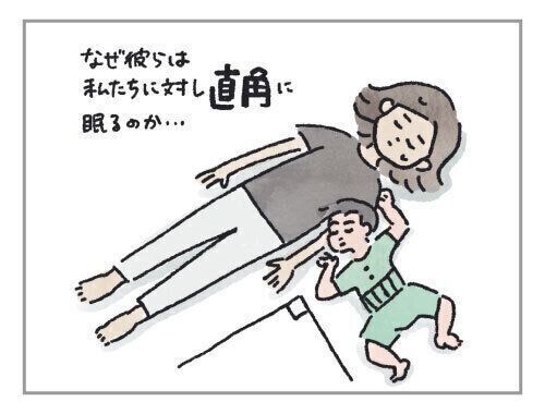 なぜ彼らは、私たちに対し直角に眠るのか・・・。親になった人の多くが、この現象を体験しているようですね。寝相がすごいというのもありますが、グニグニ動いて、なぜか、高確率で直角のポジションに収まるんですよね、謎・・・。