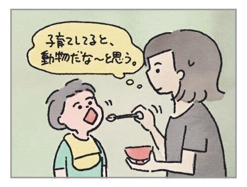 子育てしてると、自分も子供も、動物だなーと感じます。自分から乳が出てきた時は、牛かと思ったし、子連れで周りに警戒してる時は、熊かと思ったし(ハハのさけび#18参照)、離乳食を与えてるときは、鳥かと思いました(ハハのさけび#47参照)。育児ってすごく本能に近い行為なんでしょうね。