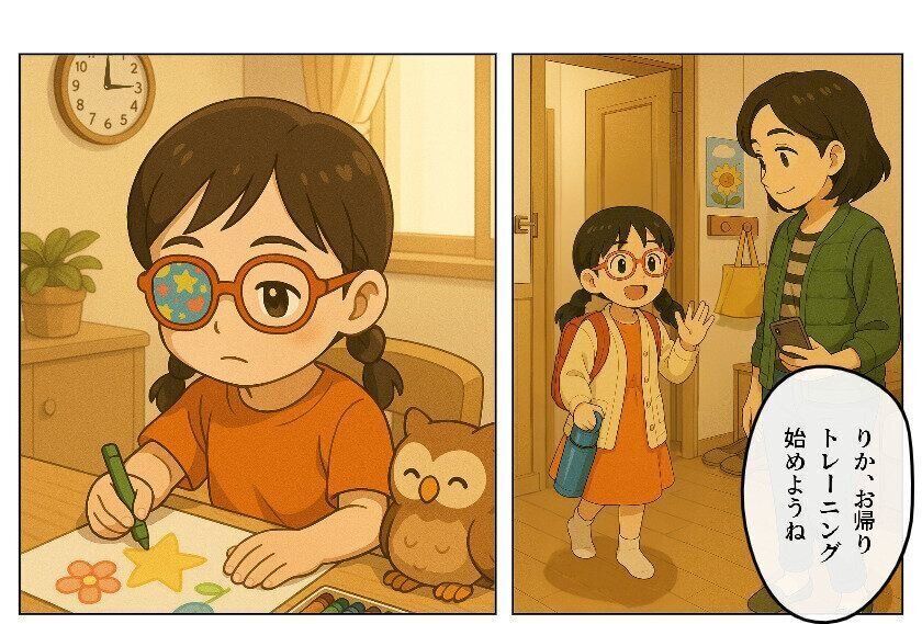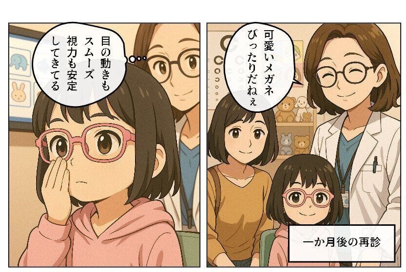 あいちゃんは、すぐに眼鏡を作って、毎日かけて、アイパッチで視力がいいほうの目を隠して、視力不良の目を使う訓練を続けることで、3カ月後には、眼鏡をかけると右が0.8、左が0.2に。