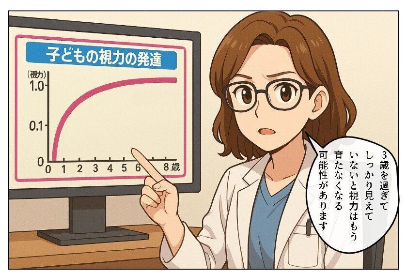 3~4歳の視力は0.6~0.9です。あいちゃんは、左目だけ視力の育ちが遅れている不同視弱視(ふどうしじゃくし)でした。