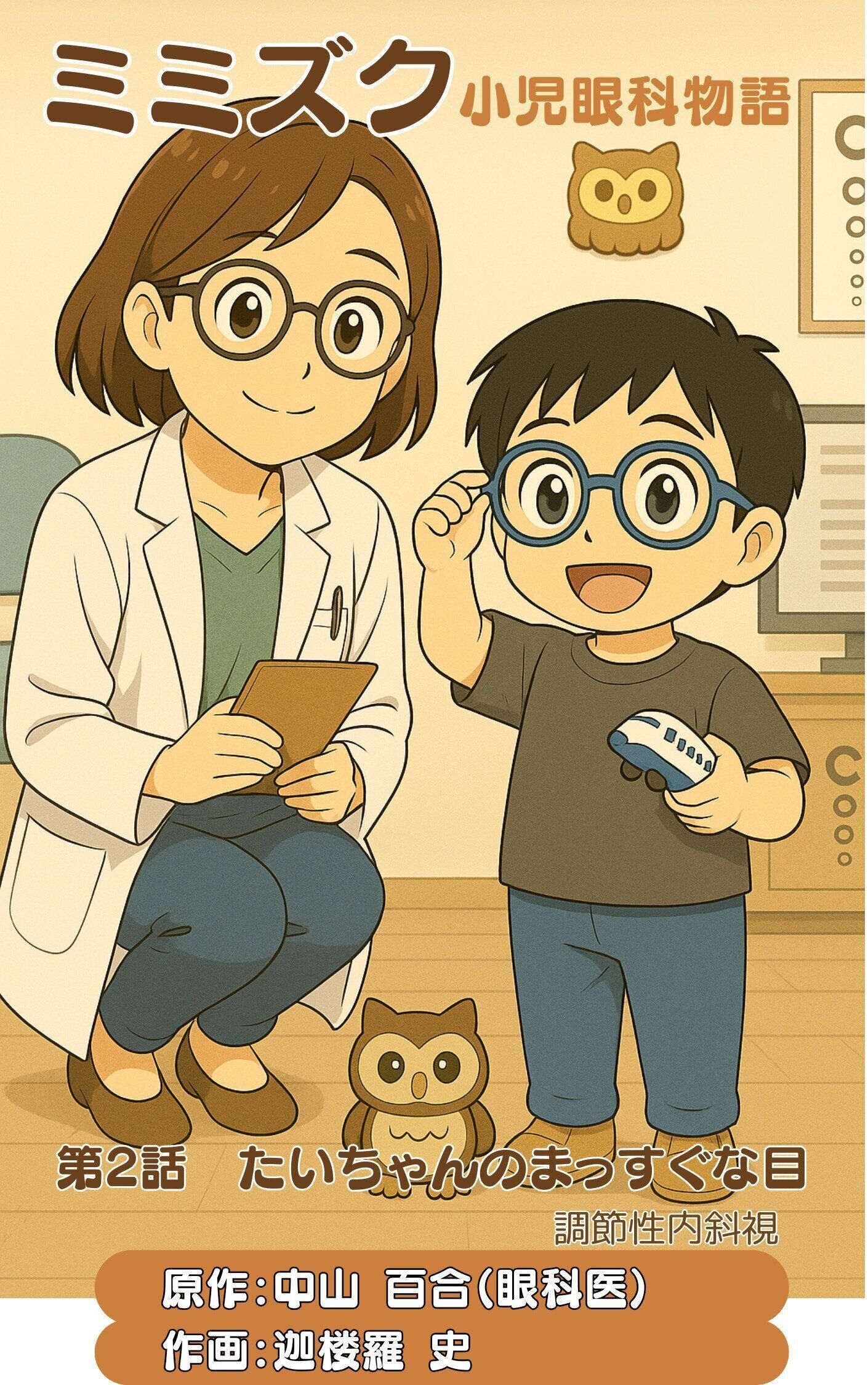 子どもの目の病気や治療について、マンガでわかりやすく解説。「第1話 奈々子ちゃんのメガネ 屈折異常弱視」「第2話 たいちゃんのまっすぐな目 調節性内斜視」などシリーズ化していて、amazon Kindleで現在第10話まで無料公開中。2025年秋からは、「第11話 逆さ睫毛」、「第12話 斜頸を伴う斜視」、「第13話 スマホと斜視:スマホ内斜視」を連載予定。中山百合原作、迦楼羅 史作画