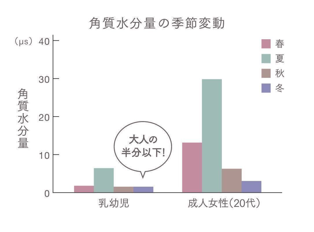 赤ちゃんの肌は水分量が少ないため、季節を問わず乾燥しやすく、バリア機能も未発達でとてもデリケートです。とくに秋~春は水分量が少ないので、毎日のスキンケアで肌を潤し、皮膚の保湿機能やバリア機能を健やかに保ちましょう。