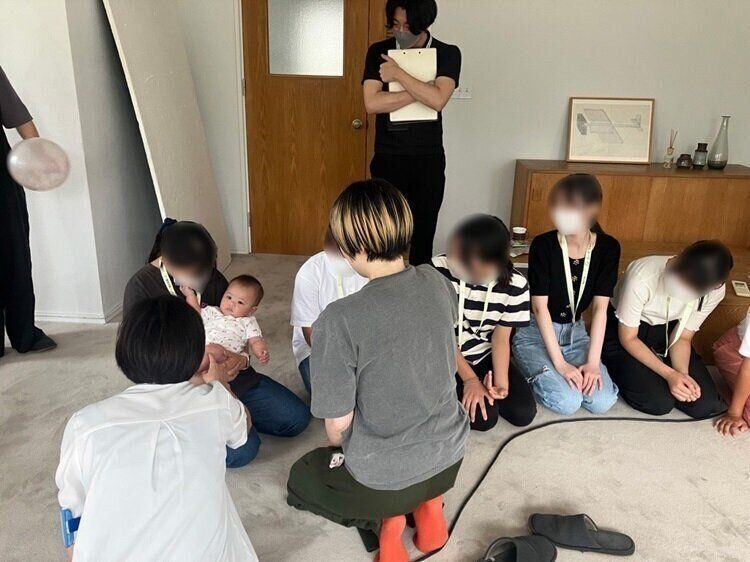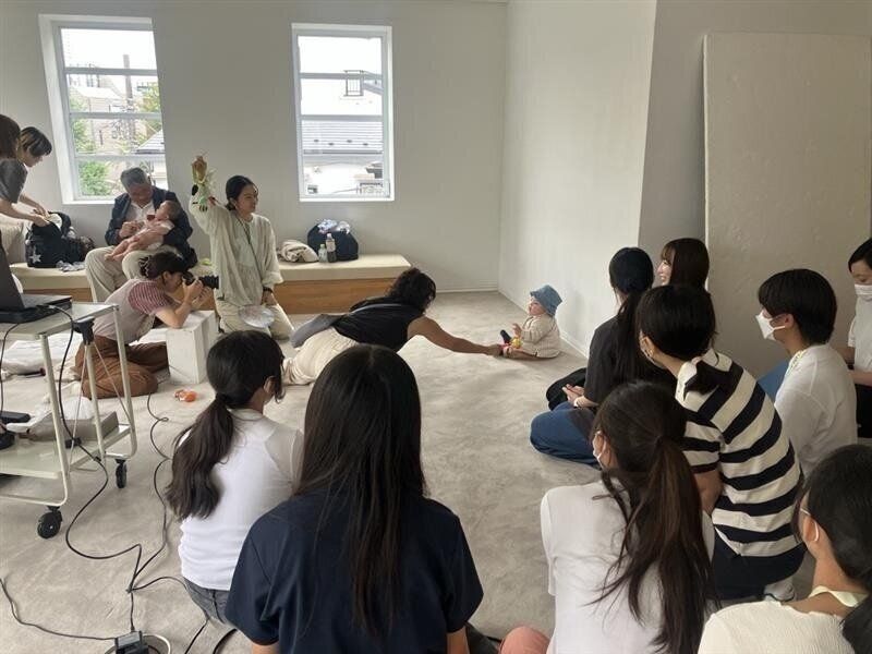 ▲無事撮影が終わってママにOKをもらい、赤ちゃんを順番に抱っこさせてもらいました。生まれて初めて赤ちゃんを抱っこしたという参加者がほとんど! 「思ったより重いね」「私は軽いと思った」「柔らかいね」と、普段接することのない赤ちゃんとのふれあいに和気あいあい。