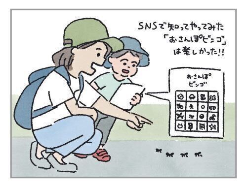 それから、これもSNSで見て試して面白かったのが「おさんぽビンゴ」。余ったダンボールにマジックで描いて、4×4のビンゴを作成。「チューリップ」「アリ」「くるま」「走る人」などを絵で描いてビンゴを作り、いざ散歩へ!散歩途中で見つけたものにシールを貼っていって、ビンゴを楽しみました。ビンゴを作るときも、季節的に見つけられそうなものを考えたりするのが楽しかったですよー。