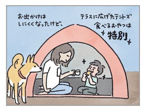 SNSで、テントを出すと子どもが喜ぶというのを見かけたので、早速実践。なるほど、テラスにテントを出したらすごく喜んでいました!普段と同じおやつをテントの中で食べるだけで、途端にピクニック感が出て特別な感じに。これはいい。