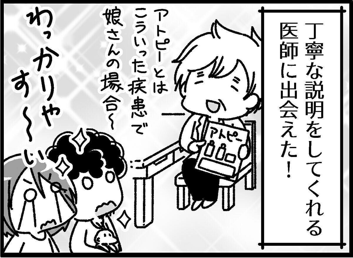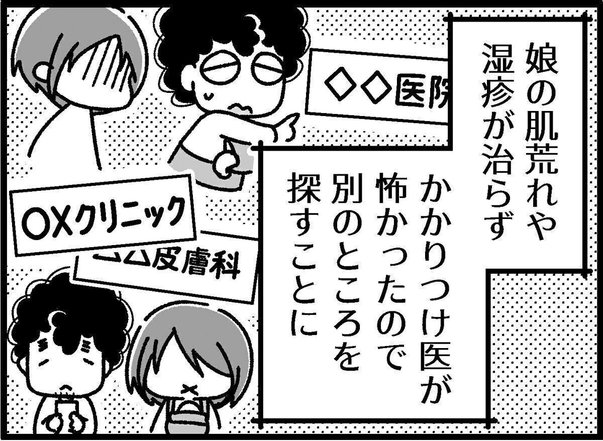 いつまでも治らない娘の肌荒れや湿疹に「アトピー性皮膚炎」という診断がおり、むしろホッとした青鹿夫妻。病名と治療方法がわかり、夫婦一丸となって対応できるようになったのはよかったのですが、今度は様々な疑問に悩まされることに。