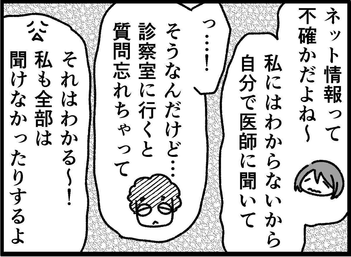 私もずっとそんな状態で1人で悩んできたんです。やっと相談したら答えてくれる医師が見つかり、夫も参加してくれるようになったからまだマシだけど、それでも不安になると検索魔(検索するのをやめられない)になってズブズブと時間を溶かしてしまう……。
