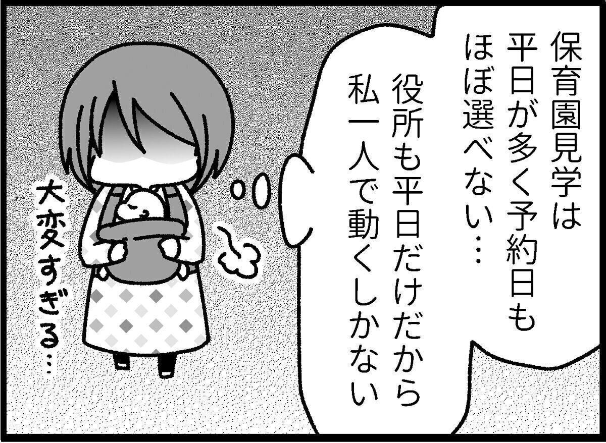 保育園への問い合わせも見学も、自治体の保育課への相談も、基本的に受け付けてくれるのは平日の昼間のみ。夫は仕事中で、なかなか動くことは難しく、保活のすべてが私1人にのしかかってきました。