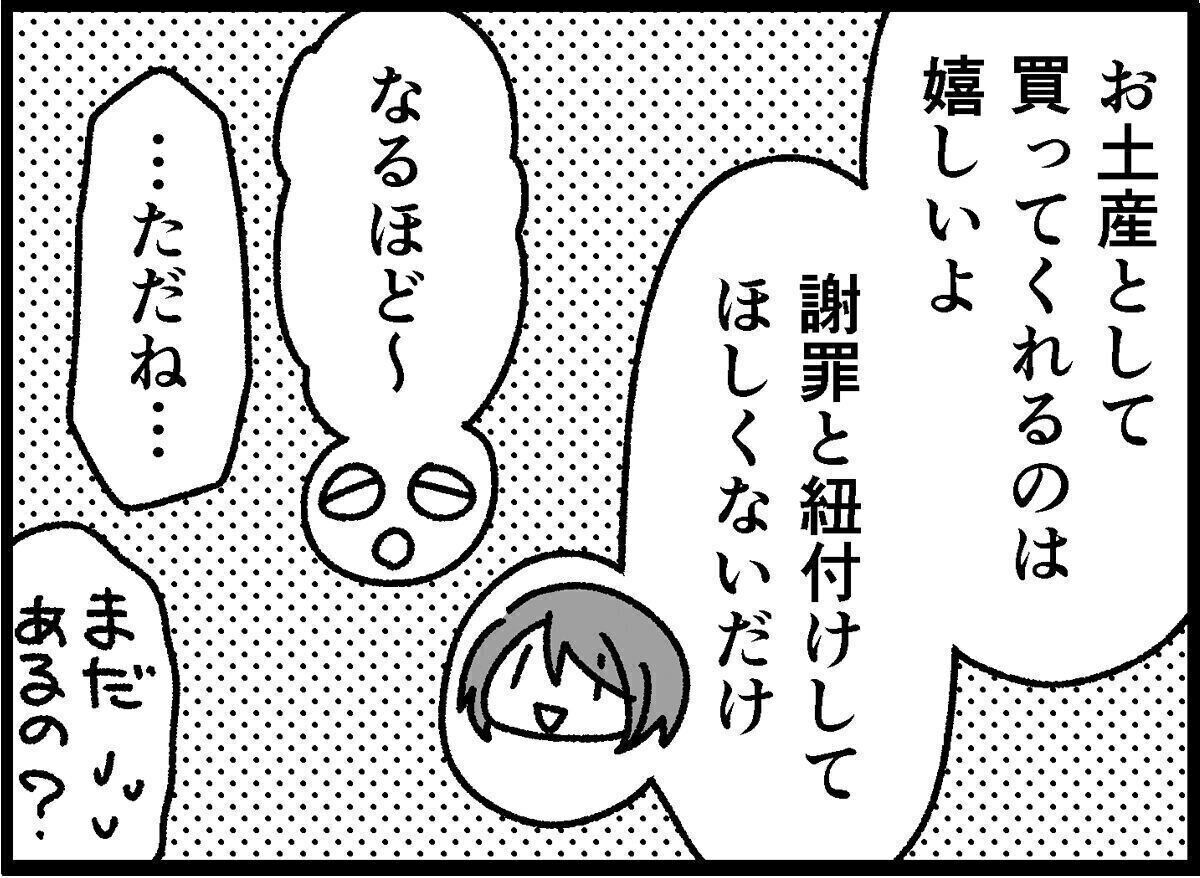 そして「今後はスイーツを買って帰るのはやめるね」と言ったので、それはちょっと違うことを伝えました。お土産で買ってきてくれるものはとても嬉しい! ただ謝罪と紐づけた買い物をやめてほしい旨を伝えました。