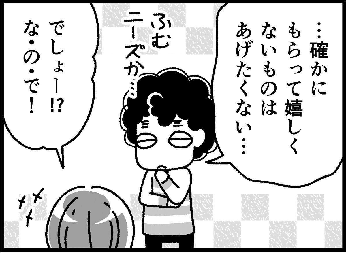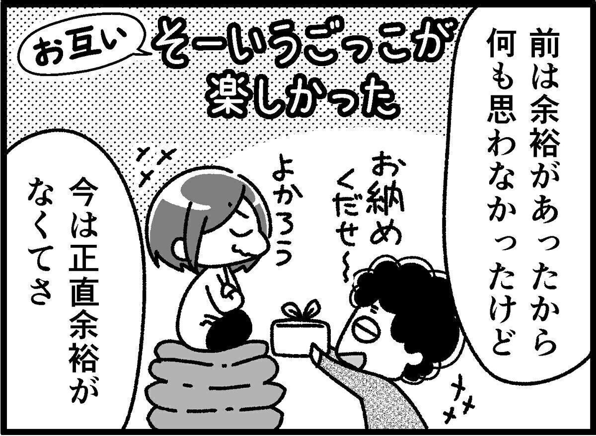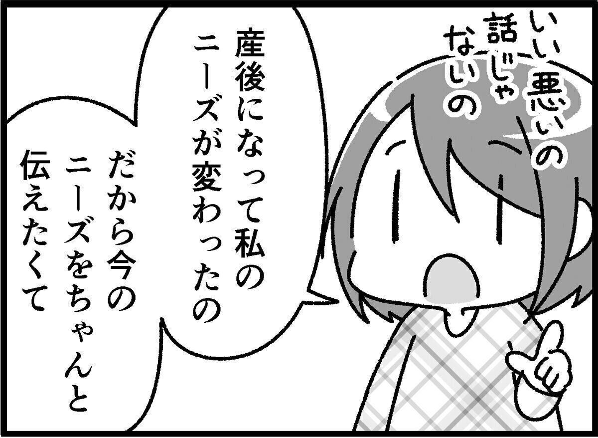 私の伝え方が悪かったのもあるのですが、夫は最初ムッとした顔をして「物で清算しようとしているわけじゃないんだけど」と答えました。それはその通り。だって産前は私もそのやりとりを楽しんで「それでよし」としていたのだから。どっちがよいとか悪いとかの話をしたいわけじゃなく、私のニーズが変わったという話をしたいと伝えました。