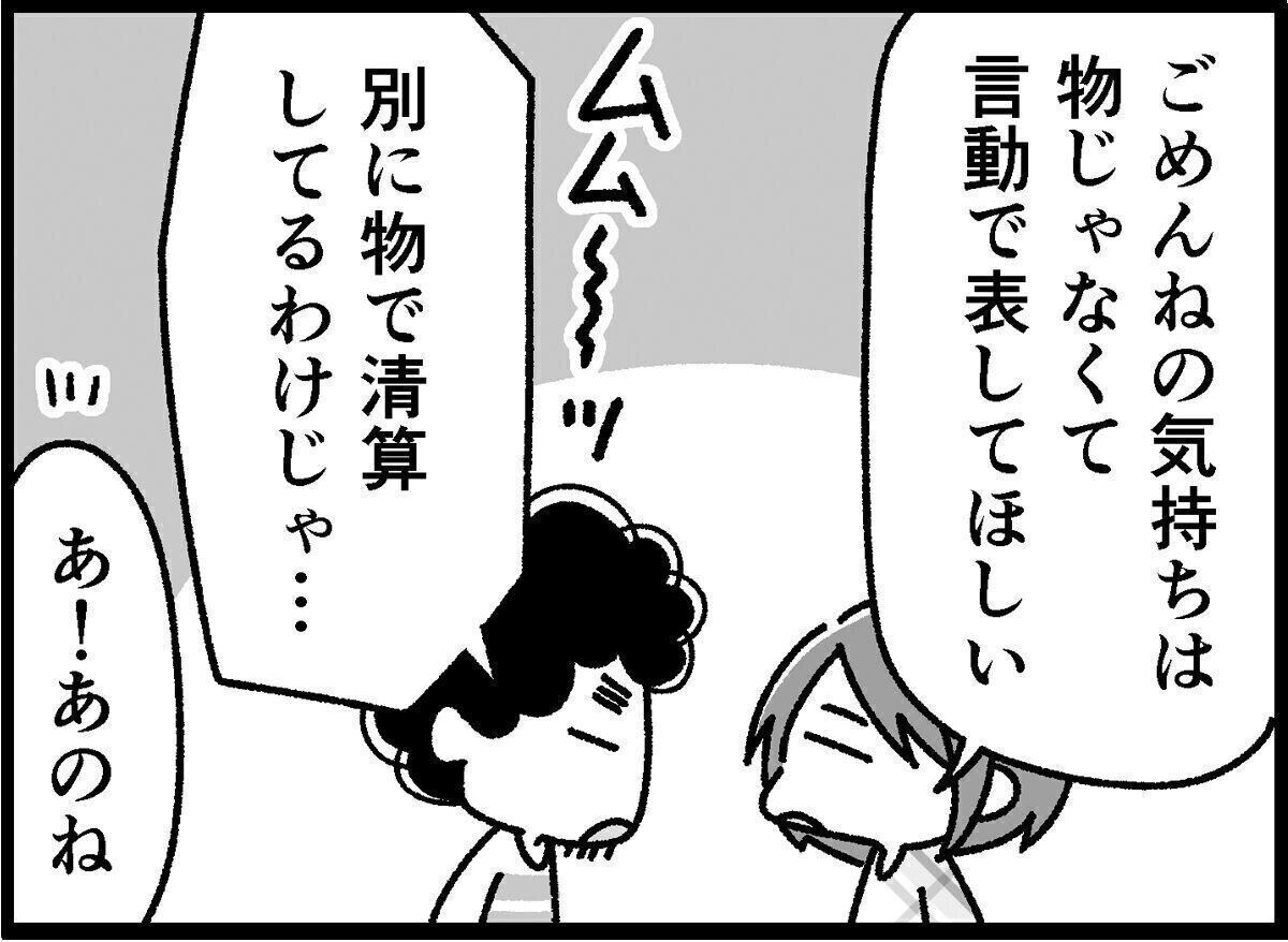 産前、夫からもらって嬉しかった「ごめんねスイーツ」。しかし産後に同じことをしてもらっても嬉しくないどころか、むしろイライラするようになった私。そこで夫に「今後はごめんねの気持ちを、物じゃなくて、言葉や行動で表してほしい」と正直な気持ちを伝えました。