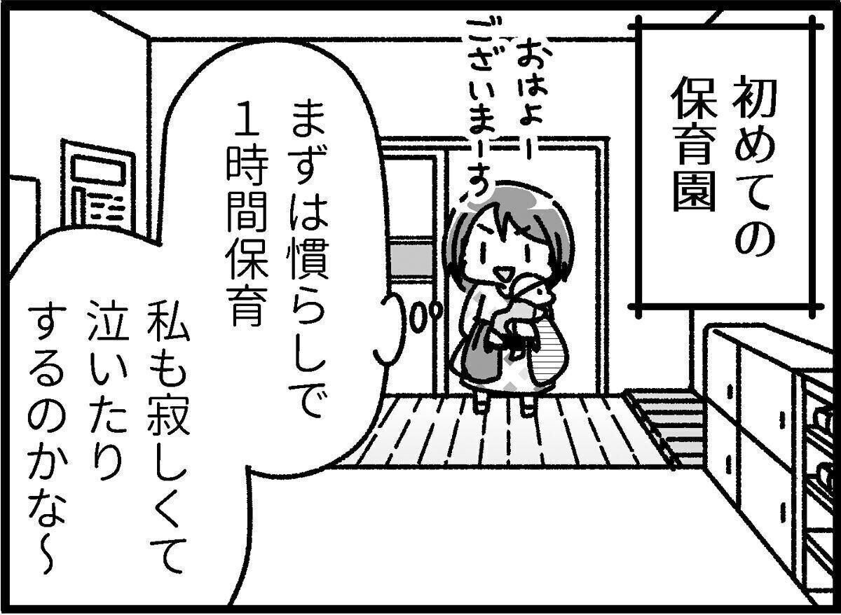 バタバタと始まった慣らし保育1日目! 今までずっと娘・ふーみんと一緒にいた私は、離れるのが初めてだったので、「親子ともに保育園に早く慣れたらいいな」「ふーみんも私も寂しくて泣いてしまったりするのだろうか」と不安に思いながら保育園のドアを開けました。