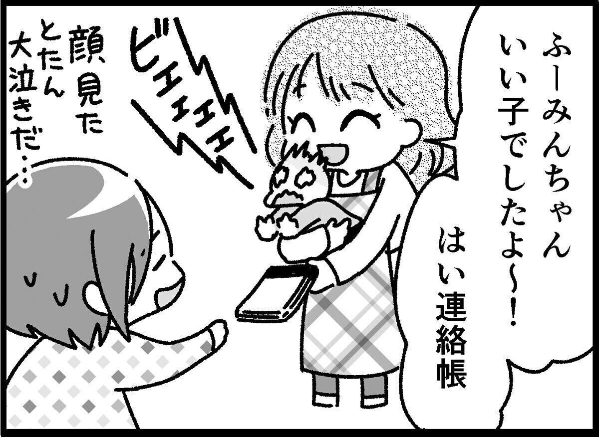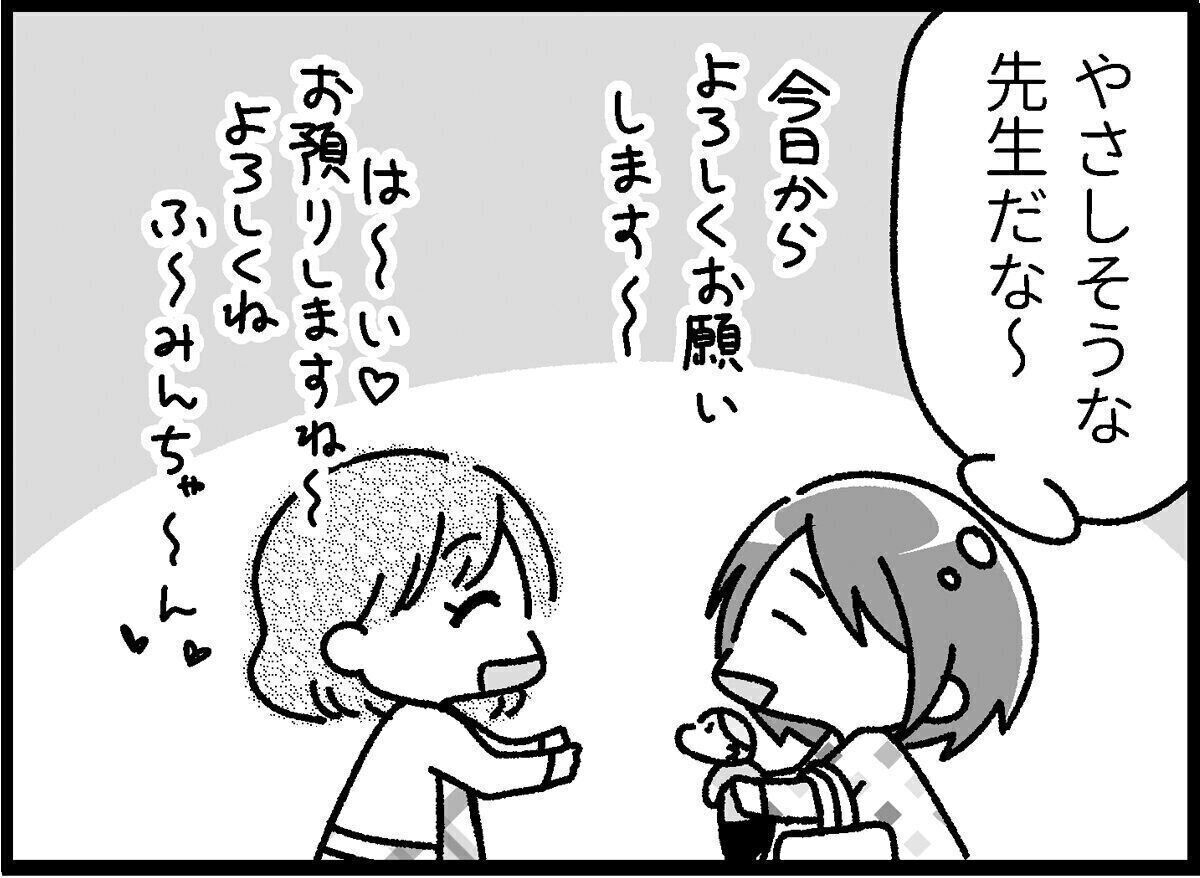 柔和な物腰で「今日からよろしくお願いしますね~」と話しかけてくれたM先生。最初はキョトンとしていたふーみんだったのですが、M先生に手渡したところ、即ギャン泣き!