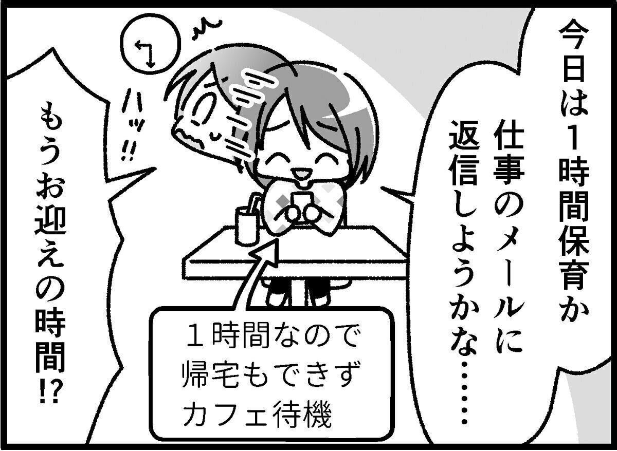 初日の慣らし保育は、たったの1時間。保育園は自宅から遠かったので、いったん帰ることもできず、近くのカフェに入って仕事のメールをしようと思いました。今日は仕事は手に付かないだろうと思いつつ、メールに集中しはじめたところ、あっという間に1時間が経過! ヤバい! お迎えに行かなくちゃ!