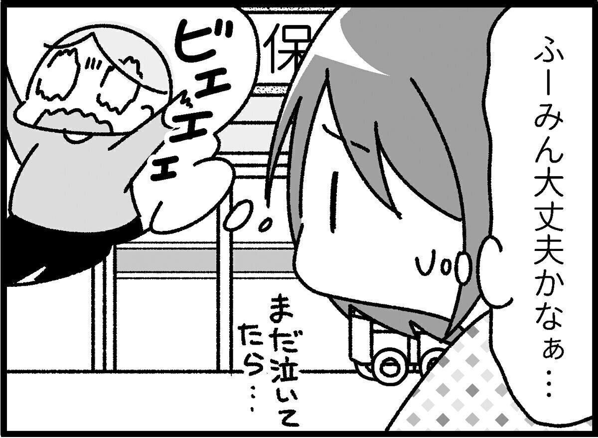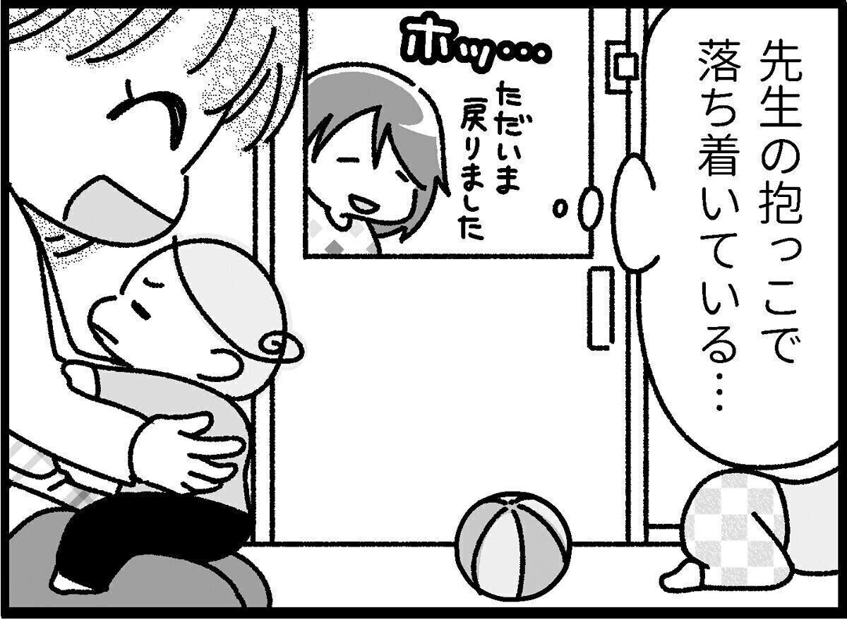 「ふーみんは大丈夫だろうか?」と保育園の窓からのぞいてみると、そこには先生に抱っこされて不満な顔ながらも泣き止んでいる娘の姿がありました。