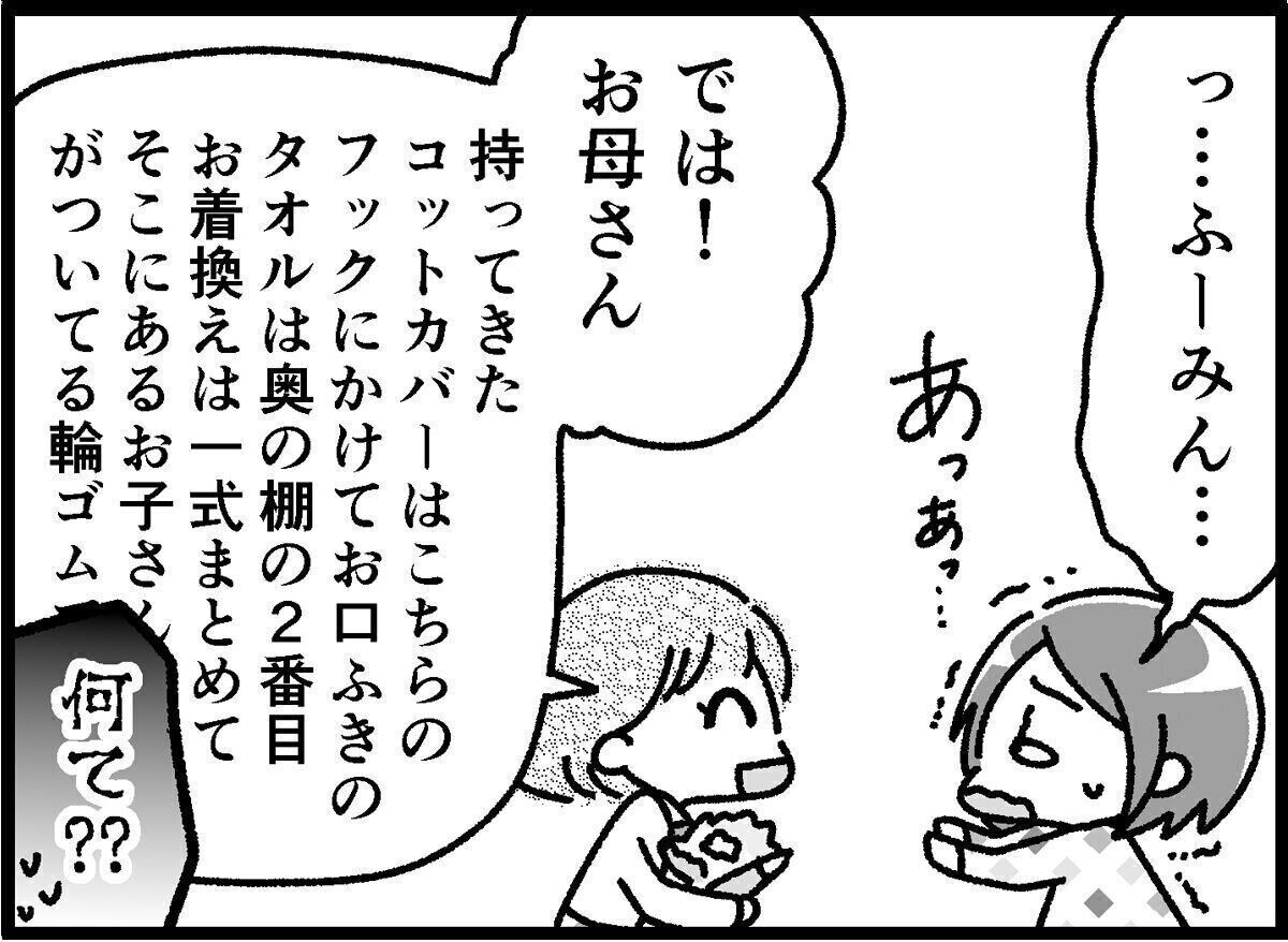 「あぁ~!ふーみんがあんなに泣いてしまっている……っ!」と私がオロオロしかけたところ、先生は笑顔のままで「じゃあ、お母さん!」と登園してから親がすべき一通りの準備を、怒涛の勢いでレクチャーしてくれました。