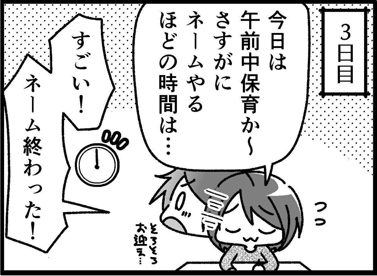 3日目、ふーみんが保育園に慣れるのが早かったので、午前保育となりました。少しまとまった時間があったので、ネーム(漫画の設計図のようなもの)作業に取り組んでみることにしました。ただ、産後は切り替えが下手になって3時間ではネームを描ききれないこともあり、あまり期待せず取り組んでみたのですが、ものすごくはかどってビックリ!