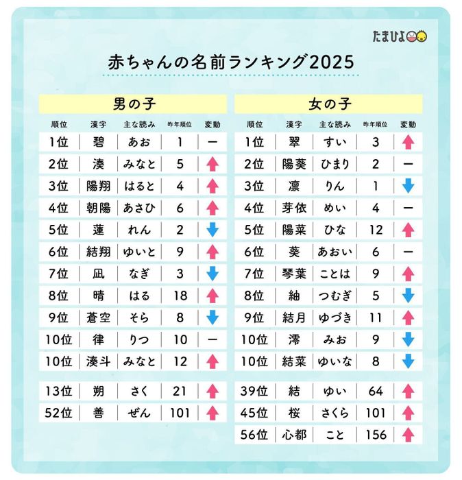 男の子の名前では、「朝陽(あさひ)」が昨年6位から4位にランクアップ。また昨年18位だった「晴(はる)」が8位に。青や空を連想させるような名前が上位に入っています。女の子の名前は、「陽菜(ひな)」が昨年12位より5位にランクアップ。2位の「陽葵(ひまり)」にもあるように、暖かさを感じる「陽」という漢字が人気です。