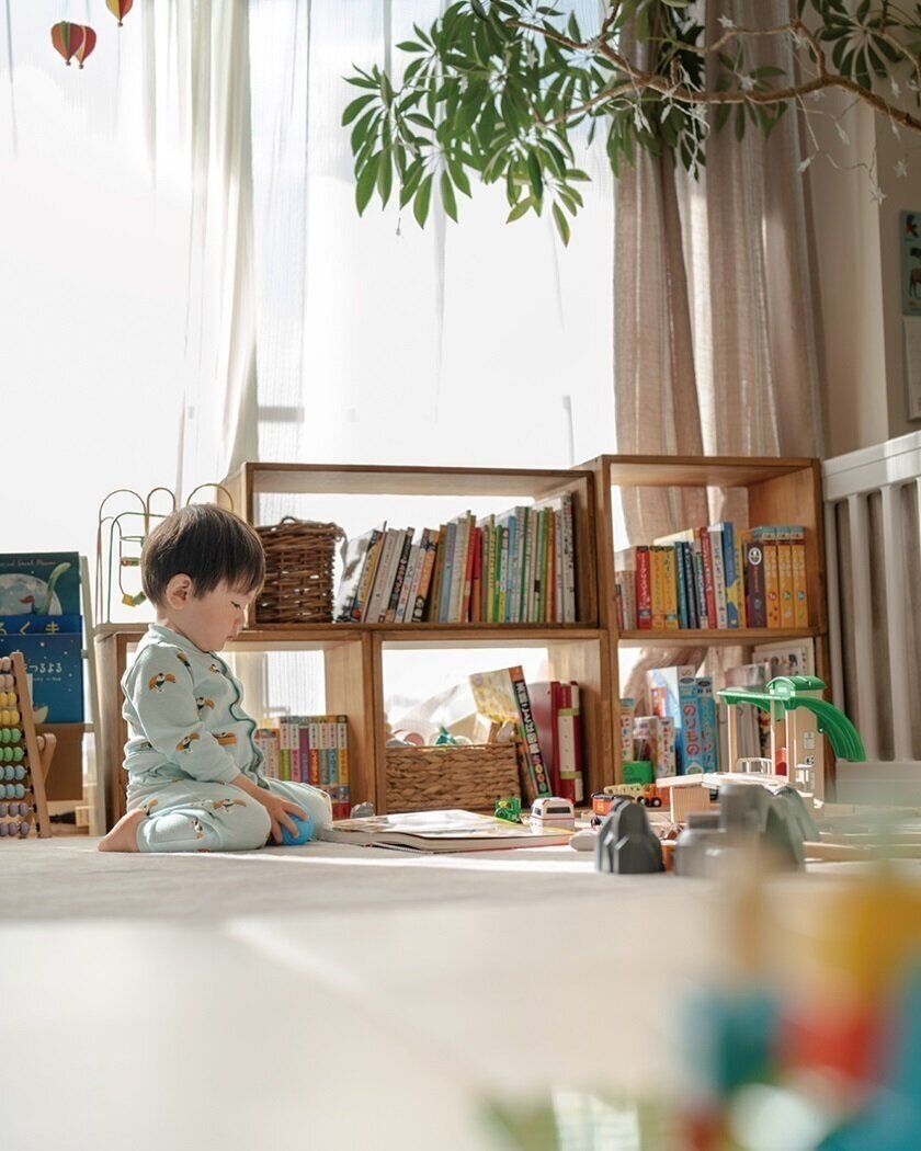 柔らかな光が差し込む部屋で、子どもの表情が見えるようにローポジションで。