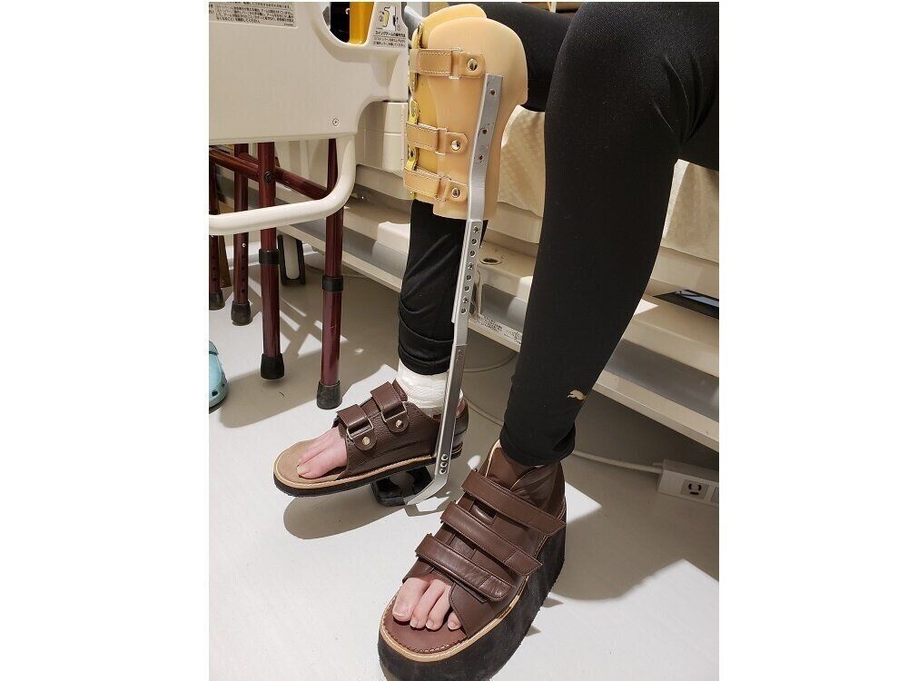 「ひざから下に体重をかけないようにするために、装具をつけての退院となりました。右足首を固定しているため、正座はできません。これは今も変わりません。さらに今では左右で足の長さが変わり、右足が3㎝ほど短いので、かかとを上げる(底上げする)装具も使っています。