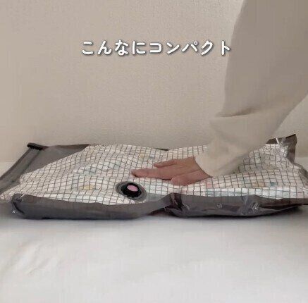 長期の帰省や旅行では子どものオムツがたくさん必要になり、かさばってしまいますよね。しろさんは3COINSの「自動圧縮バッグ」でコンパクトに圧縮しています。1,100円で別売りされている自動圧縮器を使えばあっという間にぺたんこに!衣類にも使えるのでオムツを卒業してからも長く活躍しそうですね。