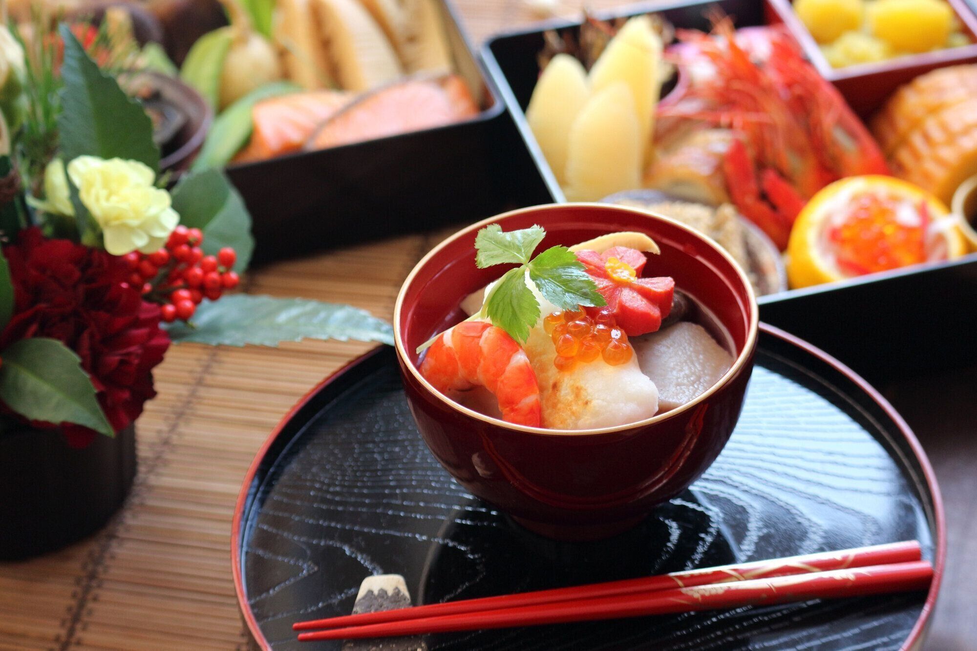おせち料理とは、もともと季節の節目(節句)に食べる料理のことでしたが、現在は主に1年の節目であるお正月にふるまわれる料理のことをいいます。料理の内容には地域差がありますが、いそがしいお正月の3日間くらいは家事をしなくて済むように保存のきく食材が中心なことと、お祝いの意味もある料理を「めでたさを重ねる」という意味で重箱につめることが特徴です。