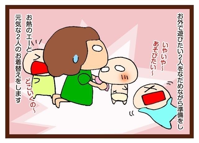 グズグズ言うエーを抱っこしながら、そして元気な2人の相手をしながらなんとか準備をこなします。