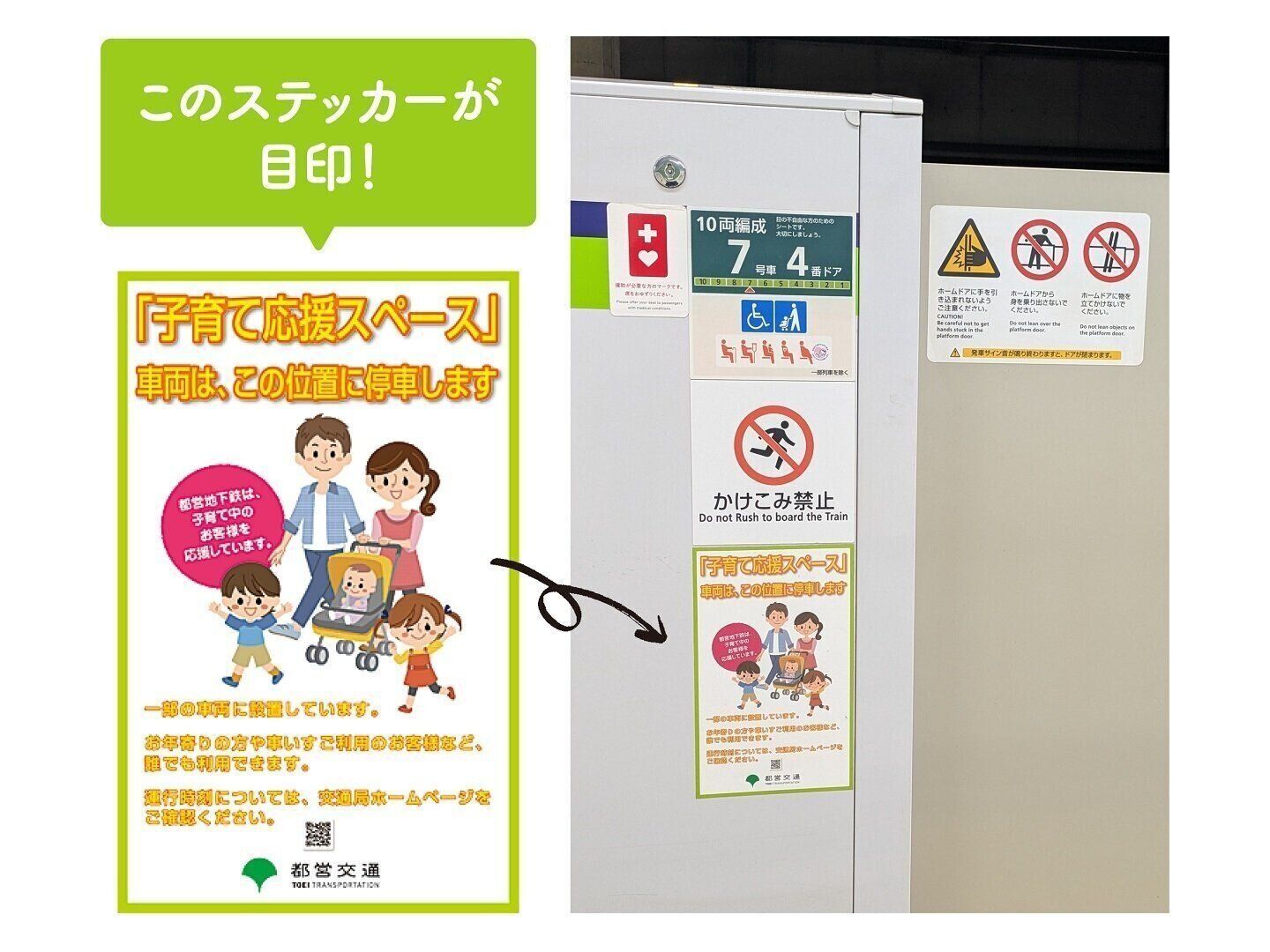 都営地下鉄各駅のホームドアには、「子育て応援スペース」の停車位置の目印となるステッカーがはられています。これを目印にして、お目当ての電車の到着を待ちましょう。(都営新宿線は4・7号車)