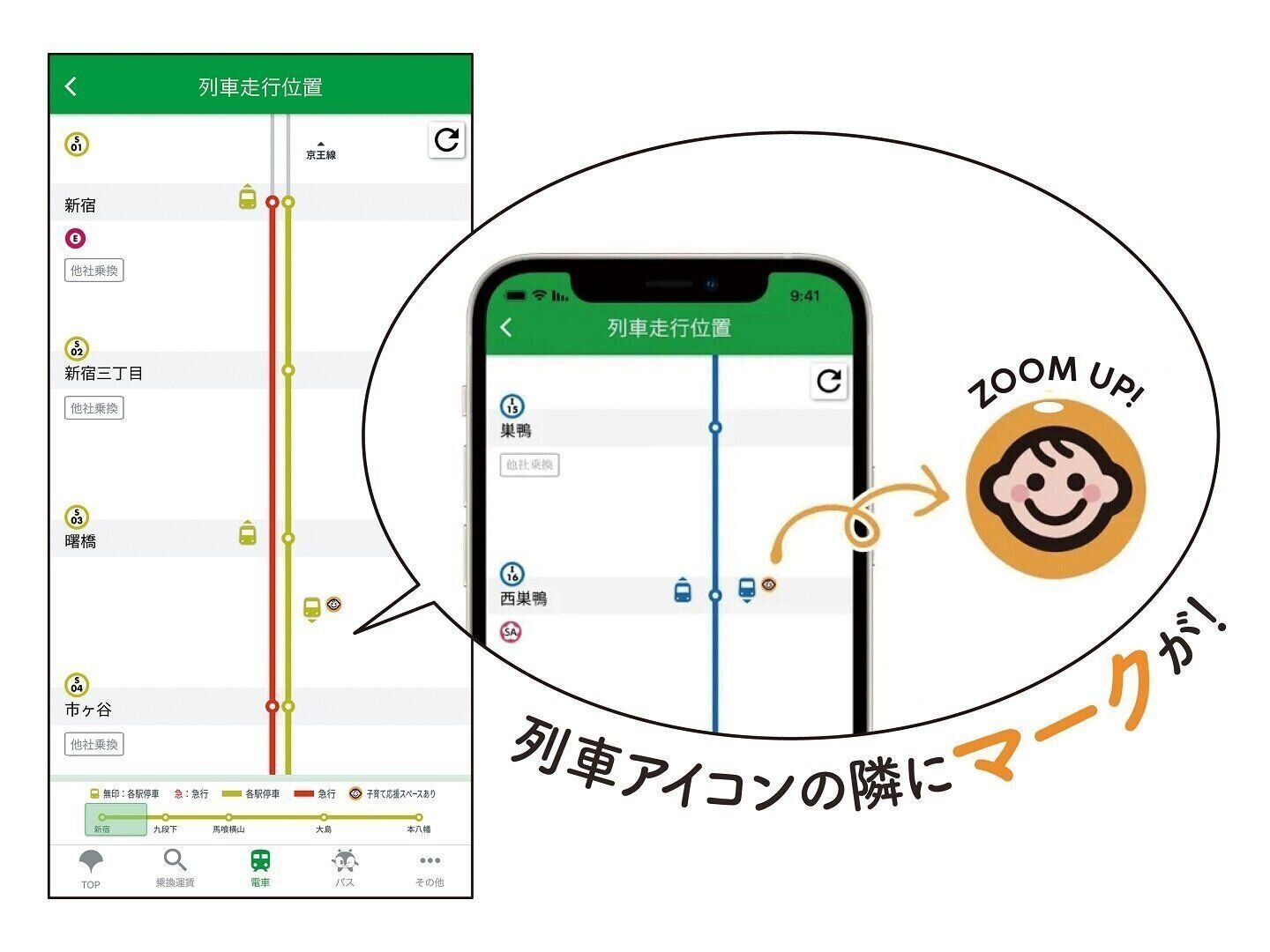 「子育て応援スペース」を設置している車両は毎日運行。主な駅の発車時刻は東京都交通局ホームページに掲載され、毎日更新されているので、乗車当日に確認を。また、都営交通アプリでは、該当車両の走行位置も確認できます。