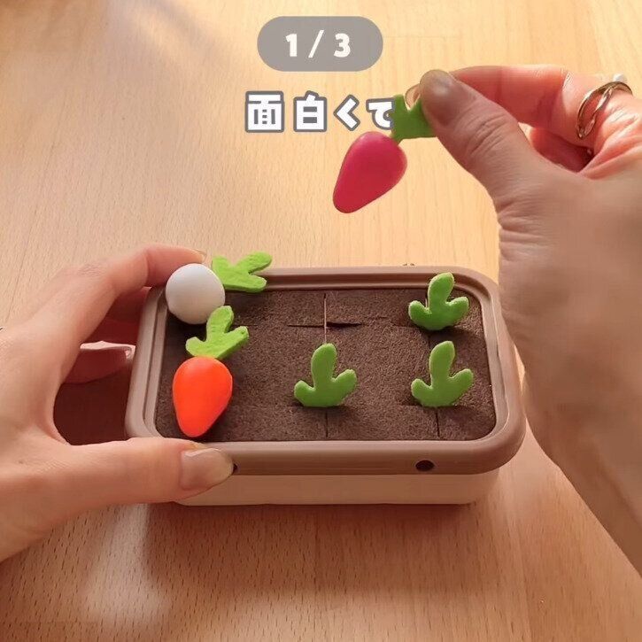 こちらは、emachi_momさんがセリアで購入した「ほのぼのファーマーゲーム」。畑に見立てたボードで、野菜を植えたり抜いたりして遊べるのだとか。同じ野菜をそろえて、神経衰弱のようにして遊ぶこともできるようです。野菜を抜く感覚がおもしろくて、お子さんは夢中で遊んでいたとのこと♪