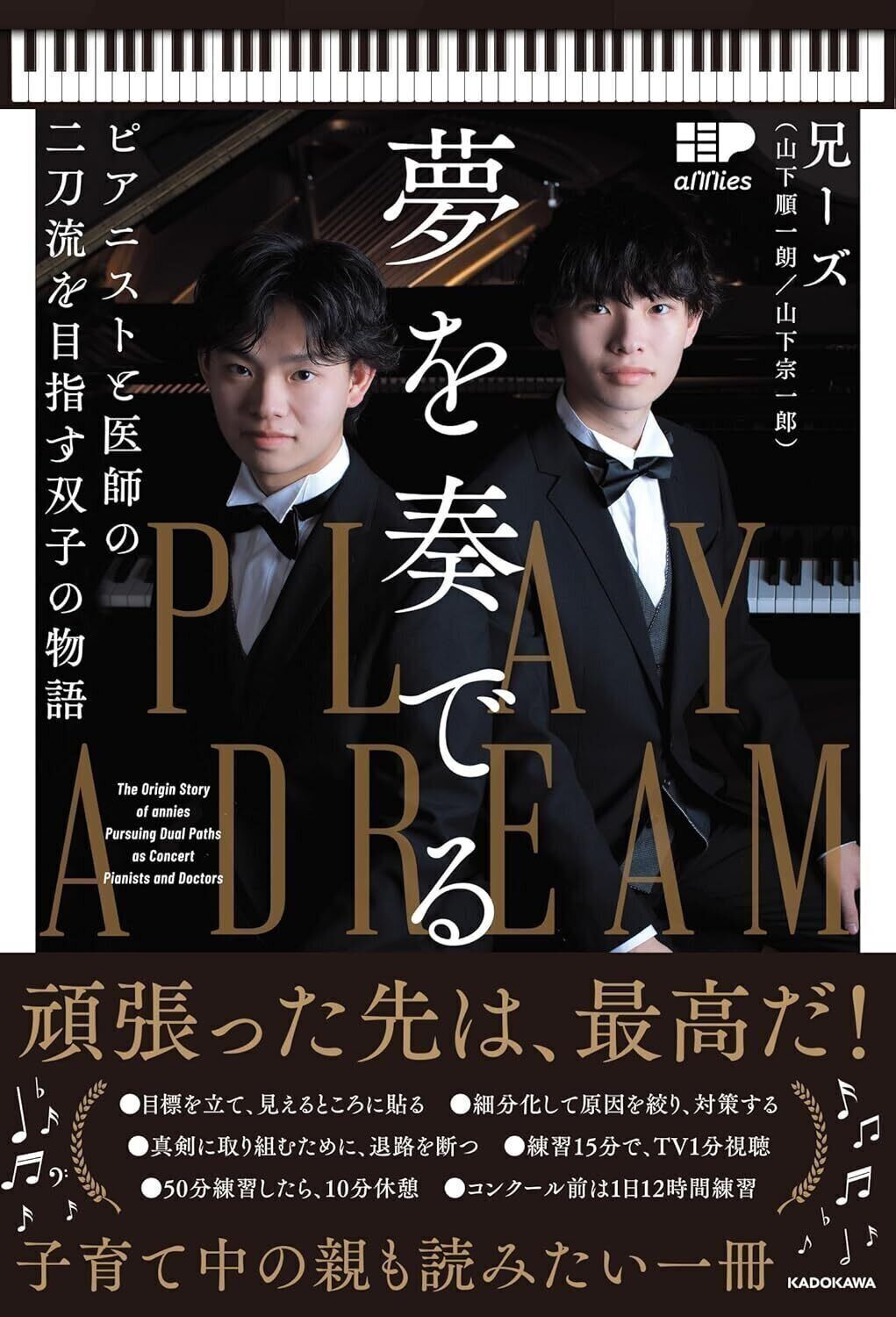 双子連弾ピアニストとして2024年3月にプロデビューした『兄ーズ』、山下きょうだい。ピアニストと医師の二刀流をめざす双子の挑戦と、家族の絆を描く物語。兄ーズ(山下順一朗・ 山下宗一郎)著/1760円(KADOKAWA)