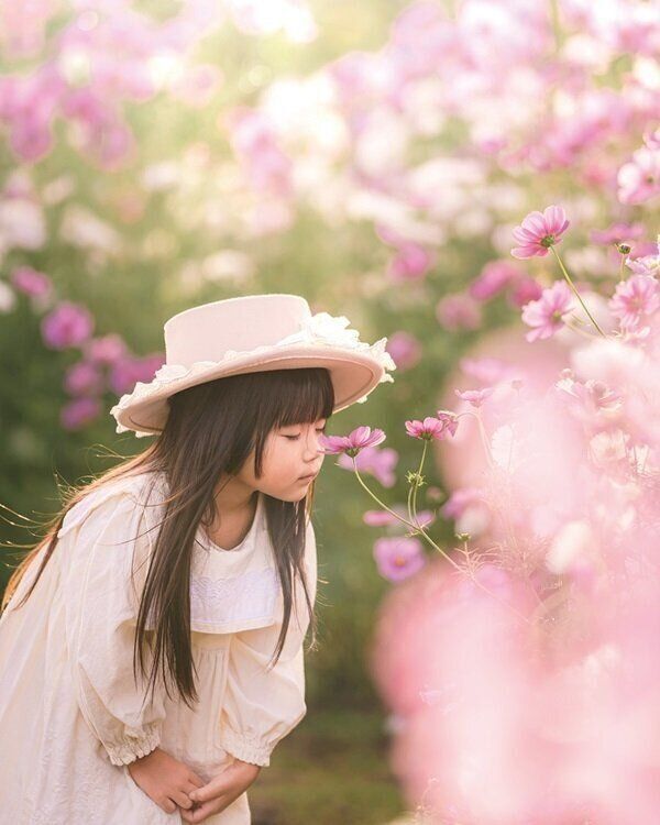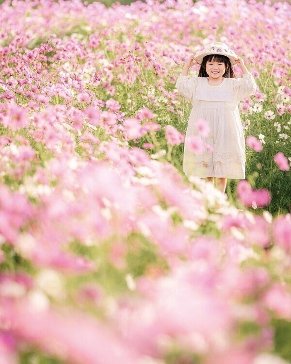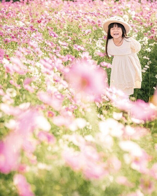 望遠レンズは、圧縮効果でお花の密度がギュッと上がり、華やかな世界にわが子がいる写真を撮れます。