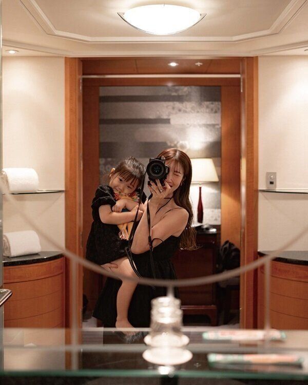 ホテルでかわいい鏡を見つけたら、親子でミラーセルフィーがオススメです。親子で一緒の撮影を楽しんで思い出を写真で残そう!