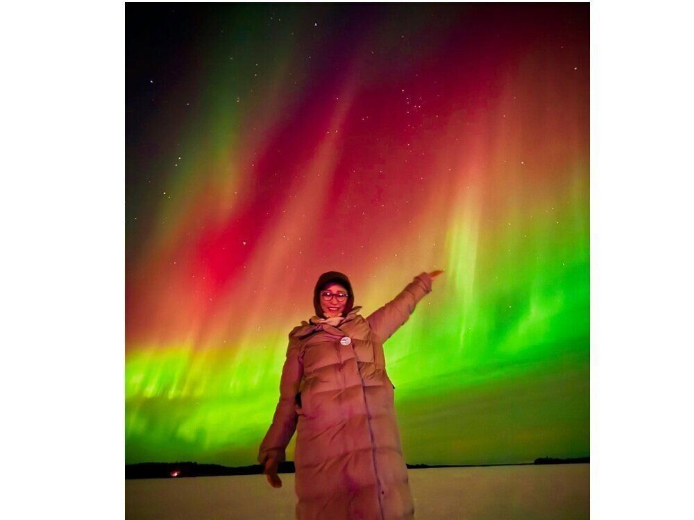 2025年5月、フィンランド滞在中の杏さん。オーロラの下で笑顔。(杏さんInstagramより)