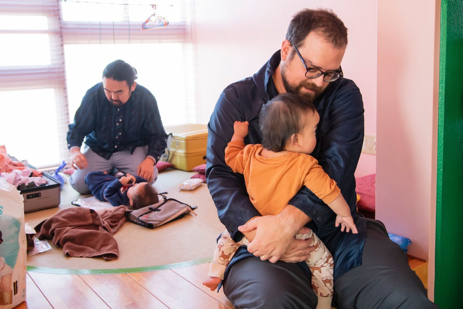2人のおむつ替えタイム。医さんとフォレストさんは、息を合わせて双子のお世話をしています。