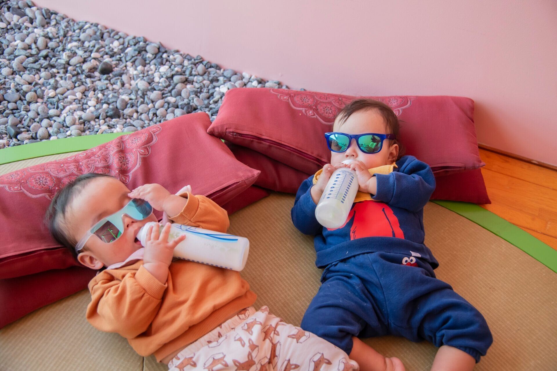 三鷹天命反転住宅の和室での双子のミルクタイム。まあるくデザインされた畳と丸い石が特徴です。